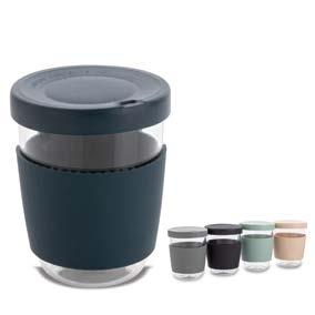 Trinkbecher 360 ml Ein hübscher Trinkbecher für den morgendlichen Coffee-to-go oder auch als Kaffee- oder Teebecher im Büro geeignet. Das Material besteht aus Boro silikatglas und Silikon. Art-Nr. 851.P432.701.1 CHF 12.00 / 200 Stk.