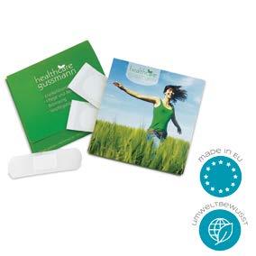 Ein beliebtes Give-Away bei Gross und Klein. Das Set enthält 10 Pflaster, hergestellt aus Zellstoff und Rohrzucker. Der Karton stammt aus nachhaltiger deutscher Waldbewirtschaftung.