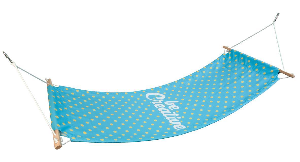 Eine klassische Hängematte aus Recycling-PET mit einem Tragegewicht von 100 kg und Holz- und Metalldetails.