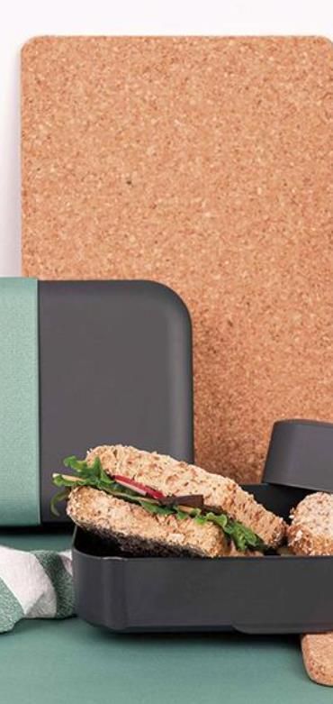 Die Box besteht zu 100% aus Recyclingkunststoff von Produktionsabfällen. Sie ist mikrowellengeeignet und geht dank dem Gummiband in der Tasche nicht auf.