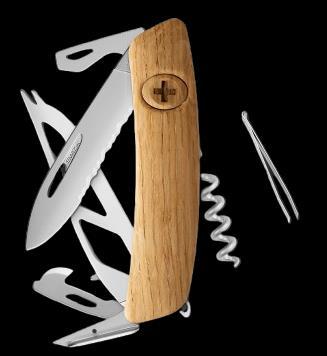 Le couteau suisse regroupe des fonctions polyvalentes dans un design compact. Avec une lame dentelée, un couteau à fromage, un poinçon, un ouvre-boîte, un décapsuleur-tournevis et un tire-bouchon, il est le compagnon idéal pour les aventures en plein air.
