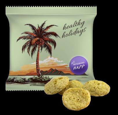 Découvrez les chips petit pois-maïs en maxi-sachet publicitaire. Les chips de qualité bio sont fabriquées en Allemagne. Elles sont composées de farine de maïs et de pois et sont affinées avec du sel marin. Le pur plaisir de grignoter.