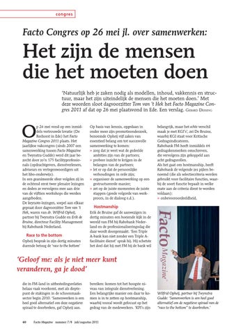 Het zijn de mensen die het moeten doen ‘Natuurlijk heb je zaken nodig als modellen, inhoud, vakkennis en structuur, maar het zijn uiteindelijk de mensen die het moeten doen.’ Met deze woorden sloot dagvoorzitter Tom van ’t Hek het Facto Magazine Congres 2011 af dat op 26 mei plaatsvond in Ede. Een verslag. GERARD DESSING