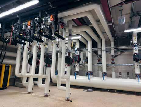 In de compacte technische ruimte komen alle leidingen tezamen om vervolgens te worden vertakt verder naar boven in de kantoorgebouwen. Foto’s: Equans
