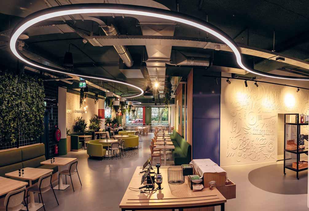 Het is een decoratieve lichtlijn, maar tegelijkertijd is deze ook functioneel aangezien het ook de hoofdverlichting is. “Die combinatie zie je niet zo vaak. We hebben de lichtlijnen met een lengte van drie meter werden met Wieland-connectors aan elkaar verbonden en elke lichtlijn voorzien van RGBW-leds die zowel de primaire als pastelkleuren kunnen weergeven. Ongeveer vijf meter lichtlijn zit op 1 driver met vier kanalen. In totaal zijn er ongeveer 60 drivers geïnstalleerd, steeds met vier adressen. Deze komen samen in een DALI-systeem dat installateur Heijmans voor de opdrachtgever heeft geprogrammeerd. Het systeem kan flexibel worden aangepast naargelang de behoefte. Aanvullend hebben we de ruimte voorzien van een aantal spanningsrails met standaard spotjes en boven de bar is een lichtlijn in de vorm van een soort racebaan geplaatst.