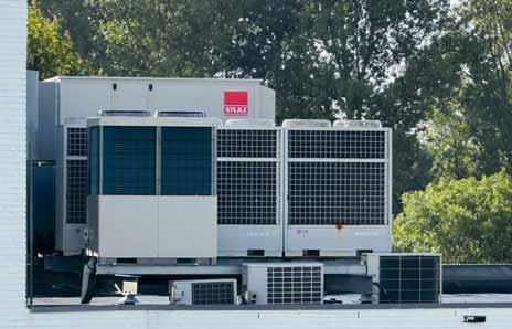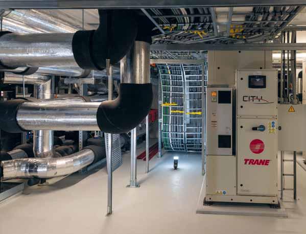 gesloten. De koeling wordt grotendeels rechtstreeks door de bodem geleverd. Daarnaast gebruiken we ook lucht/water-warmtepompen die warmte uit de omgevingslucht kunnen halen. Die laatste gebruiken we als piekvoorziening voor als het heel koud is of als noodvoorziening en voor het herstel van de bodembalans.” In vrijwel het hele gebouw gaat de afgifte via