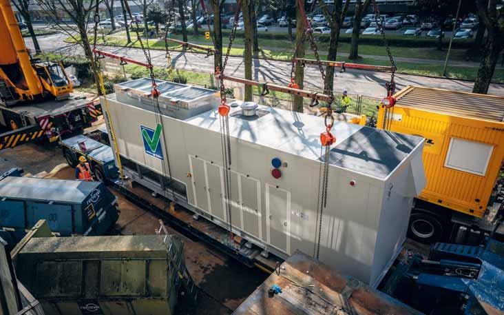 Ook de aanleg van de technische installatie in het gebouw was uitdagend, en zelfs centimeterwerk, weet Varekamp nog heel goed. “Voor de vijf waterwaterwarmtepompen - met nog ruimte voor een eventuele zesde warmtepomp - en buffervaten is een plekje gevonden in de parkeergarage onder het Outlookgebouw. We hadden maar 2,30 meter hoogte en de warmtepompen zijn meer dan twee meter hoog. We hadden maar een paar centimeter speling. Speciaal transport en slimme constructies waren nodig om apparatuur veilig naar beneden te krijgen. We hebben een soort lierconstructie gebruikt om warmtepompen gecontroleerd van de hellingbaan in de parkeergarage te laten afzakken”, aldus Varekamp.