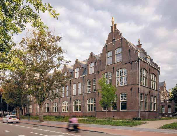 gebouw getrokken. Omdat de overkapping een rc van 6 heeft, helpt het ook enorm met de isolatie en hoeven we de gevels die grenzen aan de binnenplaatsen niet te isoleren. Omdat er strenge regels zijn voor wijzigingen in de profilering van een rijksmonument, had het ontwerpen van een passende overkapping wel wat voeten in de aarde. Samen met monumentenzorg zijn we uitgekomen op een ontwerp dat vanaf de straatkant niet te zien is, en van binnenuit veel ruimte laat om de originele daklijn te blijven bewonderen.” Verder werden ook de vloeren en de daken van binnenuit geïsoleerd en er kwam nieuw HR++-glas in de bestaande grote kozijnen en vacuümglas van Fineo in de bestaande ruitjes en in de nieuwe bouwdelen aan de buitenzijde van het gebouw. Voor de warmtevoorziening werd het monumentale gebouw aangesloten op een WKO, zegt Steenvoorden. “Het gebouw werd nog verwarmd met gasketels, maar die hebben we eruit gehaald. Het gebouw is helemaal van het gas af