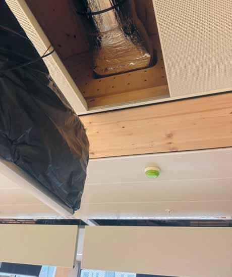 klimaatplafonds, vertelt Steenvoorden. “Hier komt eigenlijk alle techniek samen: verlichting, verwarming, ventilatie, sprinkler, sensoren, rookmelders en wifipunten. Deze eilanden zijn behoorlijk groot. We koppelen plafondplaten van 120 x 120 cm aan elkaar, drie in de breedte en vier in de lengte tot een eiland van 17