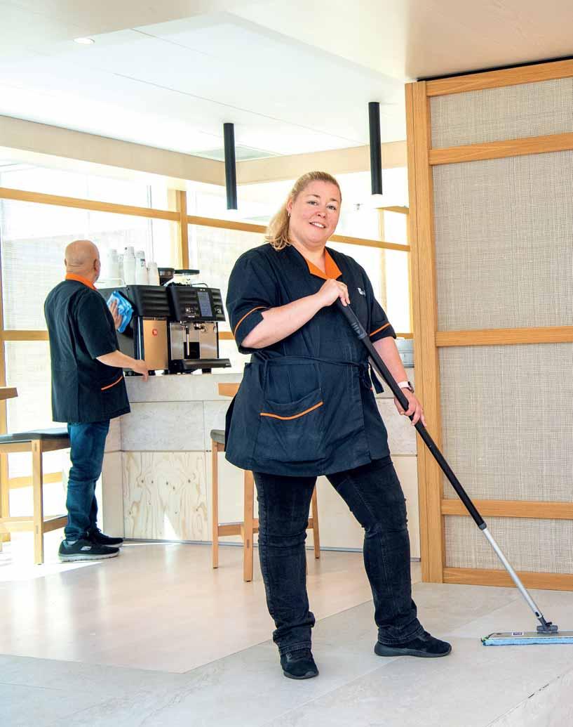 “Ik ben een soort supervisor. Ik check eerst hoe het met mijn collega’s gaat. Dan begint mijn Facility host taak. Als er mensen komen, bied ik ze een kopje koffie of thee aan. Ook vraag ik de beveiliger een gast te begeleiden en plaats ik bestellingen. Ik doe dus van alles om ervoor te zorgen dat alles in goede banen verloopt. Het merendeel van mijn tijd zit in schoonmaken. We zorgen ervoor dat alles netjes en schoon blijft: de koffieautomaten, de vloeren, de bureaus, de wc’s, maar ook alles in het restaurant.”