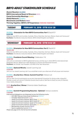 BOD: Aruchat Erev / Dinner | Fiorenzo Italian Steakhouse 7:00 PM GLOBAL: Summit Programming Resumes - Optional | Various Locations 7:30 PM International delegations are dispersed across the following tracks: • AZA BBG February Executives Conference (EXECS) • Canadian National Summit (CNS) • Jewish Enrichment Institute: BBYO Sings (JEI: BBYO SINGS) • Jewish Enrichment Institute: BBYO Stand UP (JEI: STAND UP) • Jewish Enrichment Institute: Speak UP for Israel (JEI: SPEAK UP) • Jewish Enrichment Institute: Spirituality (JEI: SPIRITUALITY) • Membership Growth Summit (MGS) • Sports Leadership Summit (SLS) Please see page 23 for the full Summit schedule.