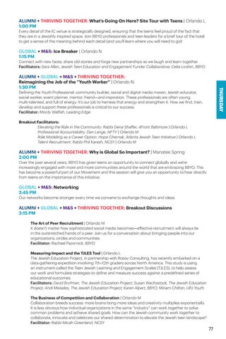 ALUMNI + GLOBAL + M&S + THRIVING TOGETHER: Breakout Discussions 3:15 PM The Art of Peer Recruitment | Orlando M It doesn’t matter how sophisticated social media becomes—effective recruitment will always lie in the outstretched hands of a peer. Join us for a conversation about bringing people into our organizations, circles and communities. Facilitator: Rachael Pazornick, BBYO Measuring Impact and the TJLES Tool | Orlando L The Jewish Education Project, in partnership with Rosov Consulting, has recently embarked on a data-gathering expedition involving 7th–12th graders across North America. This study is using an instrument called the Teen Jewish Learning and Engagement Scales (TJLES), to help assess our work and formulate strategies to define and measure success against a predefined series of educational outcomes. Facilitators: David Bryfman, The Jewish Education Project; Susan Wachsstock, The Jewish Education Project; Andi Meiseles, The Jewish Education Project; Karen Alpert, BBYO; Miriam Chilton, URJ Youth The Business of Competition and Collaboration | Orlando M Collaboration breeds success: more brains bring more ideas and creativity multiplies exponentially. It is less obvious how individual organizations in the same “industry” can work together to solve common problems and achieve shared goals. How can the Jewish community work together to collaborate, innovate and celebrate our shared determination to elevate the Jewish teen landscape? Facilitator: Rabbi Micah Greenland, NCSY