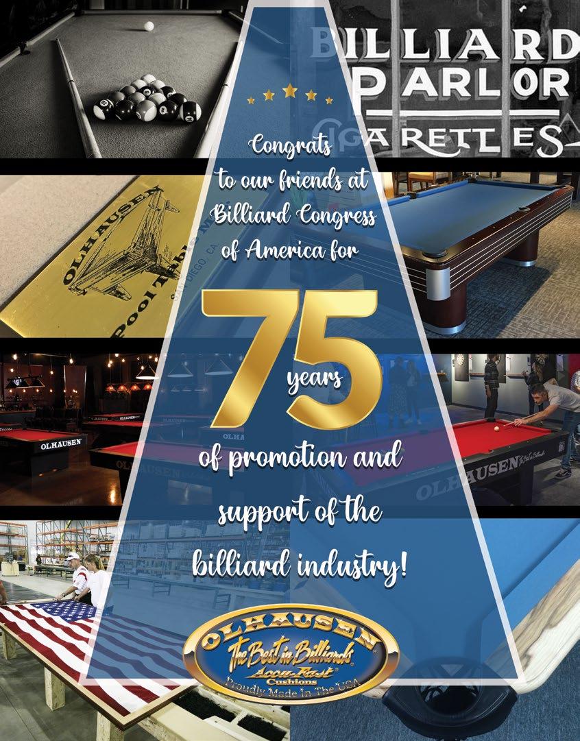 In this edition, we look back at the remarkable legacy of the Billiard Congress of America. With 75 years of unparalleled dedication to the sport and industry, we will take a closer look at the history of your association, broken down into 25year increments. We sit down with a preeminent historian of the sport, Billiards Digest’s Mike Panozzo. And we profile all BCA Directors as we attempt to read the Magic 8-Ball for the Billiard Congress of America’s next 75 years.