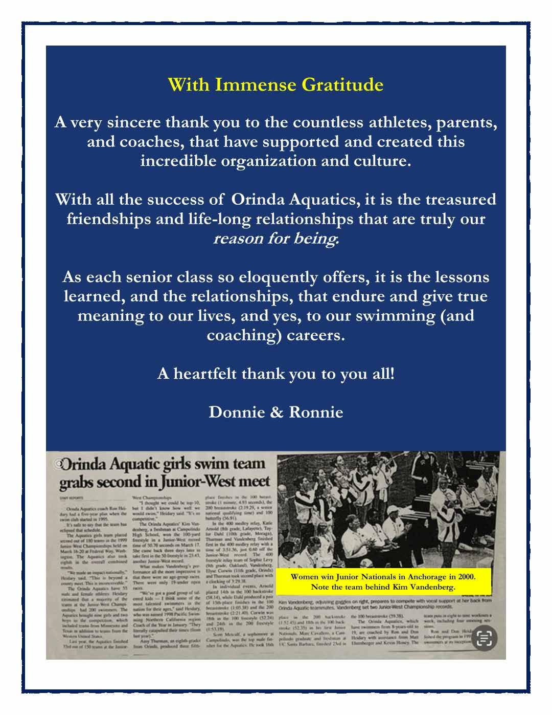 Celebrate three decades of excellence with the "Orinda Aquatics Memory Book 2023-2024," a digital flipbook commemorating our team's 30th anniversary. This special edition reflects on the remarkable achievements, memorable moments, and lasting impact of Orinda Aquatics over the past thirty years. Dive into the rich history of our swim team, relive unforgettable milestones, and honor the enduring spirit and dedication that have defined Orinda Aquatics. Join us in this tribute to our extraordinary community's past, present, and future.