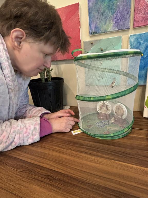 A BCArc home observed the metamorphosis of caterpillar larvae into butterflies. Using an at-home kit, the group watched as the caterpillars built their cocoons and then hatched into butterflies. They fed the butterflies sugar water to strengthen their wings and ultimately released them outside, celebrating their first flight and their adventure to new lives.