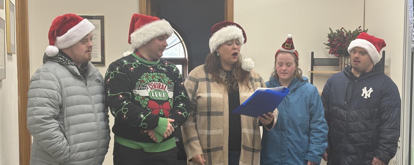 Participants from the Transitions program sang Christmas carols and spread holiday cheer at several of BCArc’s offices. Songs included Jingle Bells and Oh Christmas Tree. Pictured here, the quintet is belting out Deck the Halls.
