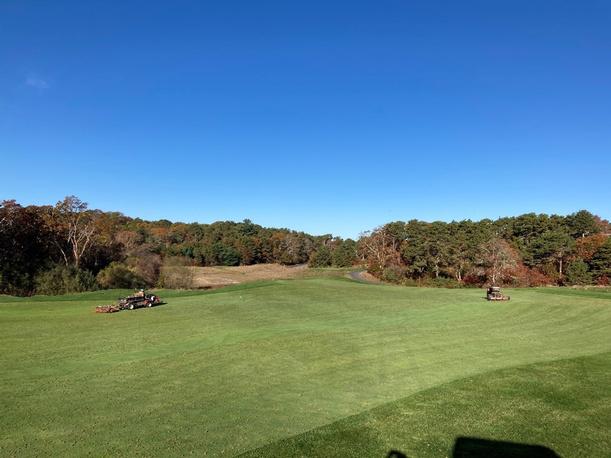 As our fall weather begins to turn colder, the Agronomy team looks to ready the course for winter. Many of the processes we complete this fall help to build a stronger product for next season. Aeration of fairways helps to reduce thatch, relieve compaction from a busy golf season as well as allow for better uptake of plant health applications. We have completed all fairway and approach aerations, and with the warm weather we have received we have had excellent recovery of the aeration holes. Pictured below is the 18th fairway being aerified, then plugs are blown into windrows and swept up.