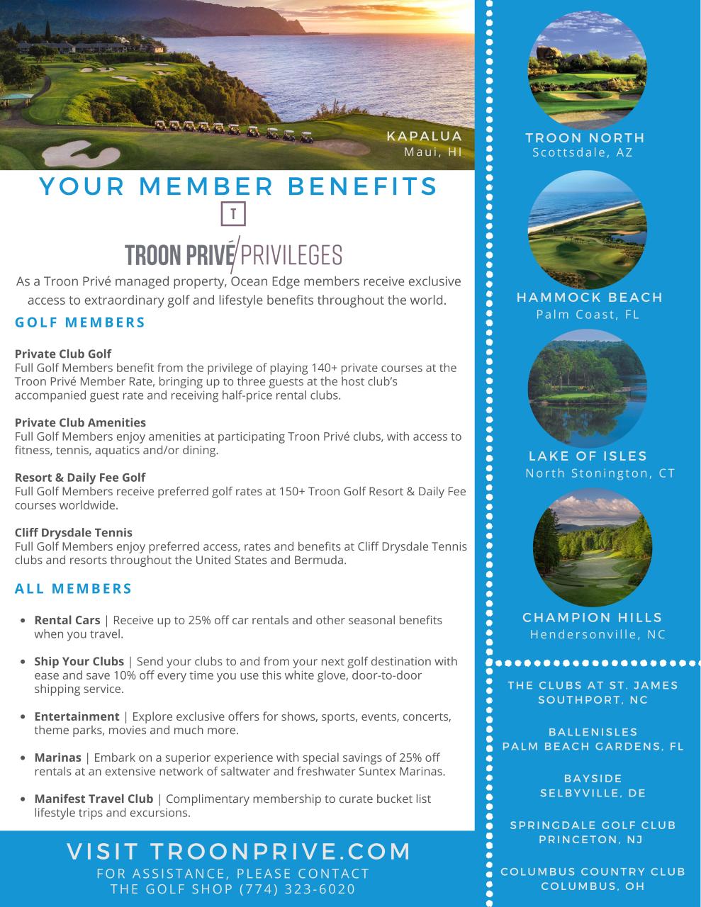 Golf members can also take advantage of the Troon Prive Program to play other Troon courses located in better winter weather. Head to (Troonprive.com) to get started and request your tee times at some great venues whether you ’ re traveling or near your home away from the Cape. It is a great value, and we encourage you to take full advantage of the program. If you have any questions about the reciprocal program email Shayne (Shayne.sakson@oceanedge.com) for help.
