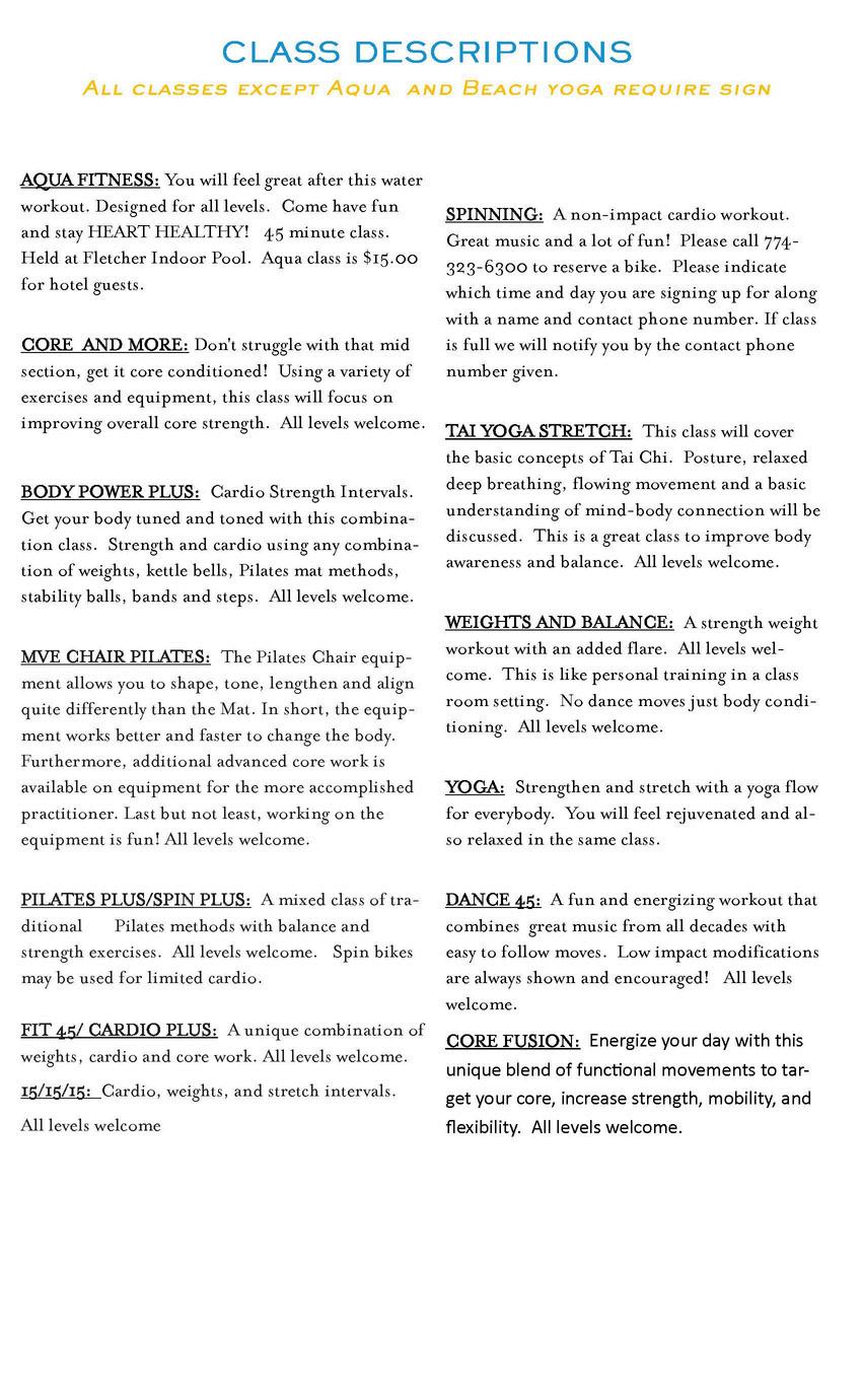 Our May/June fitness class schedule is the largest we ' ve offered since the fitness program started at Ocean Edge in 2002 Please remember that all classes except beach yoga and aqua fitness require a sign up on the member website. We look forward to seeing you and Happy Mother's Day!