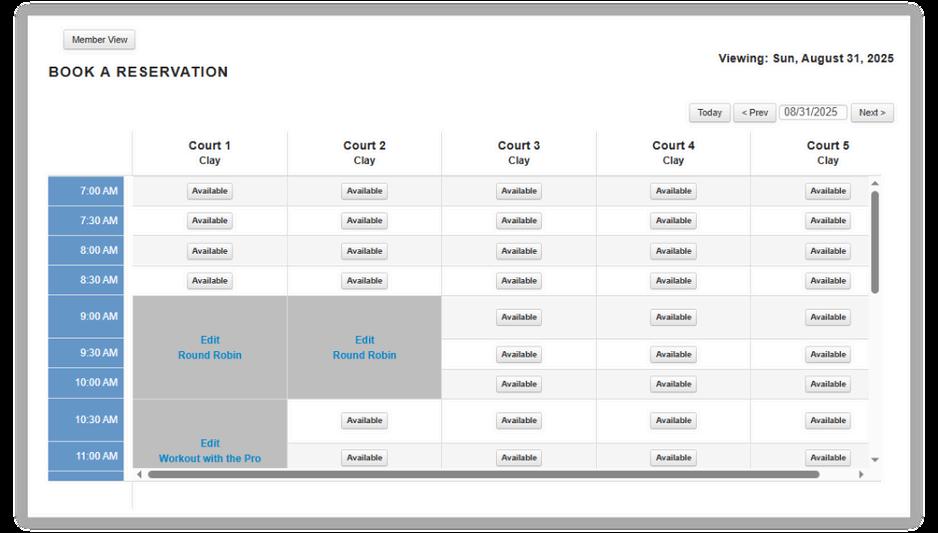 a.The court times highlighted in blue are part our our weekly racquet programming. Clicking the court reservation will bring you to the club calendar to register for the program