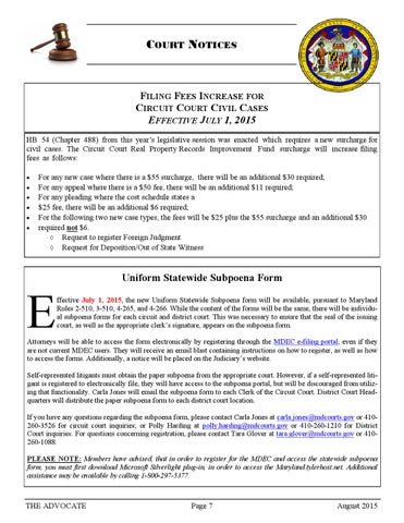 ffective July 1, 2015, the new Uniform Statewide Subpoena form will be available, pursuant to Maryland Rules 2-510, 3-510, 4-265, and 4-266. While the content of the forms will be the same, there will be individual subpoena forms for each circuit and district court. This was necessary to ensure that the seal of the issuing court, as well as the appropriate clerk’s signature, appears on the subpoena form.