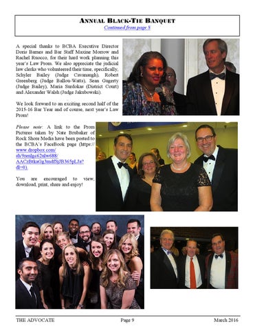 A special thanks to BCBA Executive Director Doris Barnes and Bar Staff Maxine Morrow and Rachel Ruocco, for their hard work planning this year’s Law Prom. We also appreciate the judicial law clerks who volunteered their time, specifically, Schyler Bailey (Judge Cavanaugh), Robert Greenberg (Judge Ballou-Watts), Sean Gugerty (Judge Bailey), Maria Surdokas (District Court) and Alexander Walsh (Judge Jakubowski). We look forward to an exciting second half of the 2015-16 Bar Year and of course, next year’s Law Prom! Please note: A link to the Prom Pictures taken by Nate Brubaker of Rock Shore Media have been posted to the BCBA’s FaceBook page (https:// www.dropbox.com/ sh/9renlgc62ulw688/ AACzBtkaGg3mdfSjJB365pLJa? dl=0). You are encouraged to view, download, print, share and enjoy!