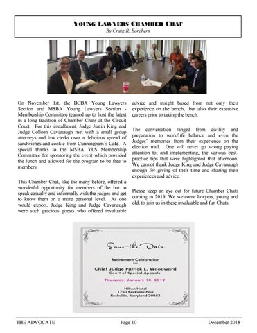 advice and insight based from not only their experience on the bench, but also their extensive careers prior to taking the bench. The conversation ranged from civility and preparation to work/life balance and even the Judges’ memories from their experience on the election trail. One will never go wrong paying attention to, and implementing, the various bestpractice tips that were highlighted that afternoon. We cannot thank Judge King and Judge Cavanaugh enough for giving of their time and sharing their experiences and advice. Please keep an eye out for future Chamber Chats coming in 2019. We welcome lawyers, young and old, to join us in these invaluable and fun Chats.