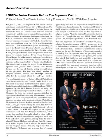 Philadelphia’s Non-Discrimination Policy Comes Into Conflict With Free Exercise On June 17, 2021, the Supreme Court issued a muchanticipated opinion in Fulton v. City of Philadelphia. The Court took votes on two freedom of religion issues: the immediate status of Catholic Social Services’ contracts with the city and the current standard for evaluating Free Exercise claims. A unanimous Court determined that the City of Philadelphia violated the Free Exercise Clause when it terminated contracts with Catholic Social Services over noncompliance with the city’s nondiscrimination ordinance. The Court voted 6-3 against reconsidering the use of the Employment Division v. Smith test, refraining from adopting a new standard for Free Exercise claims. Chief Justice John Roberts wrote the opinion of the Court, joined by Justices Stephen Breyer, Sonia Sotomayor, Elena Kagan, Brett Kavanaugh, and Amy Coney Barrett. Justice Barrett wrote a concurring opinion affirming the outcome and the inapplicability of Smith, joined by Justice Kavanaugh and, in part, by Justice Breyer. Concurring opinions from Justices Alito, Gorsuch, and Thomas focused on the use of Smith, urging reconsideration of the precedent. The case was closely watched by religious freedom activists and LGBTQ+ advocates alike for the potential fallout for LGBTQ+ families.