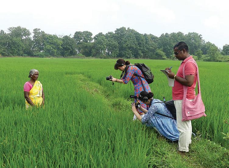 Boston College junior Lola Ellis (third from right) filming in the Thirukkalacherry rice paddy field in Tamil Nadu, India.