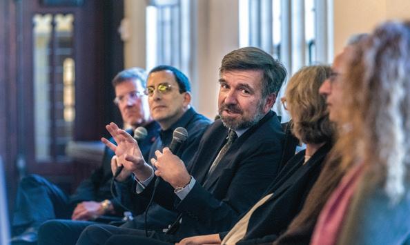 (Left) Provost and Dean of Faculties David Quigley spoke during a February 20 panel discussion in Gasson 100 on the University Core Curriculum. (Above, L-R) Faculty members Anna Wittstruck, C. Shawn McGuffey, and Lorelle Semley were among those attending the event, held in advance of the core’s 10th anniversary.