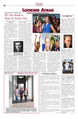 the artistic accomplishments of BC students and faculty. Hogan’s public appearances More than 1,000 Boston College during the festival will include a students, faculty and administrators Q&A following a screening of “The will display their artistic talents and Town” on April 28 at 7 p.m. in interests at the University’s 13th an- Devlin 008, and a panel discussion nual Arts Festival April 28-30. — sponsored by the Lowell LecThe festival, which last year drew tures Humanities Series — on April more than 16,500 BC alumni and 29 at 7 p.m. in Devlin 008. The area residents, includes over 80 panel, “Chuck Hogan’s Prince of events — most of them free — that Thieves and ‘The Town’: A Boston showcase performing, visual and Crime Story as Novel and Movie,” literary arts programs. Professional also includes English professors artists, many of them alumni, also Carlo Rotella and Chris Wilson. will take part. Activities for families with chilEach afternoon, music, dance dren of all ages will be offered on Doug Levy and theater events fill April 30 from noon O’Neill Plaza, the festo 5 p.m.: a parade tival’s hub; each eveled by BC’s Marchning there are several ing Band, arts and featured events. In adcrafts, story hours dition, art exhibitions for children and and demonstrations are teens, and an origiopen all afternoon, with nal theater producexhibitions continuing tion — most apinto the evening; there propriate for 5th to also are daily literary 8th graders — on Chuck Hogan ’89 (Prince of readings. Thieves) will make several bullying, written This year’s special appearances at the festival. by Theatre Departguest is best-selling author Chuck ment faculty member Luke JorHogan, a 1989 BC alumnus whose gensen and presented by students in novel Prince of Thieves was adapted his Creative Dramatics class. for the film “The Town,” directed This year’s festival, according to by and starring Ben Affleck. Ho- organizers, features a greater infugan will be presented with the an- sion of professional mentors beyond nual Boston College Arts Council BC faculty and staff members. They Alumni Award for Distinguished include artists, among them alumni, Achievement from University Presi- who have been on campus this dent William P. Leahy, SJ, at an spring to work with students in arts awards celebration and public various genres, including a cappella, reception on April 29 from 4-6:30 dance, improv theater and fashion. p.m. in O’Neill Plaza. Awards will Some mentors will return to take also be presented in recognition of part in the festival. The goal of this