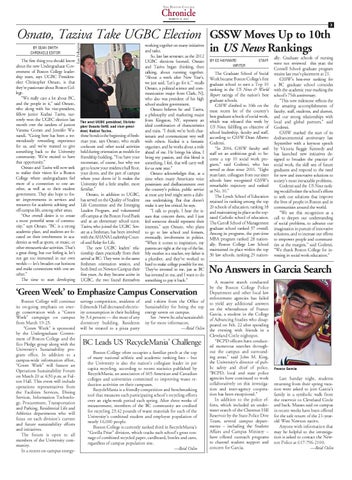 The Graduate School of Social Work became Boston College’s first graduate school to earn a Top 10 ranking in the US News & World Report ratings of the nation’s best graduate schools. GSSW climbed to 10th on the most recent list of the country’s best graduate schools of social work, which was released this week by US News, fulfilling an objective of school leadership, faculty and staff, according to GSSW Dean Alberto Godenzi. “In 2004, GSSW faculty and staff set an ambitious goal: to become a top 10 social work program,” said Godenzi, who has served as dean since 2001. “Eight years later, colleagues from our sister schools have recognized GSSW’s remarkable trajectory and ranked us No. 10.” The Lynch School of Education retained its ranking among the top 20 schools of education, ranking 18 and maintaining its place as the toprated Catholic school of education. The Carroll School of Management graduate school ranked 37 overall. Among its programs, the part-time MBA program ranked 28 nationally. Boston College Law School maintained its place within the top 30 law schools, ranking 29 nation-