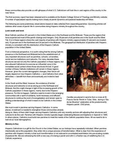 these communities also provide us with glimpses of what U.S. Catholicism will look like in vast regions of the country in the near future. The first summary report has been released and is available at the Boston College School of Theology and Ministry website. A number of specialized reports looking more closely at parish dynamics and pastoral leadership will follow. The following are some preliminary observations based on data collected from responding parishes. Upcoming articles will address other areas of parish life in communities doing Hispanic ministry throughout the country. Look south and west Most Catholic parishes (61 percent) in the United States are in the Northeast and the Midwest. These are the regions that have experienced most of the parish closings and mergers. Only 39 percent of all parishes are in the South and the West. Yet, it is in these regions where the vast majority of parishes with Hispanic ministry (approximately 61 percent) are located; only 15 percent are in the Northeast and 24 percent in the Midwest. The geographical distribution of parishes with Hispanic ministry is consistent with the distribution of the Hispanic Catholic population in the United States. From a historical perspective, it is worth noting that the strong Catholic presence in the Northeast and Midwest led to the establishment of very important structures such as parishes, schools, universities, social service institutions and networks. For many decades these structures served not only the Catholic population in these regions, but also allowed Catholicism to exercise an influential voice in the immediate social context where those structures thrived. A good number of these Catholic institutions will remain in these regions. However, given the current demographic changes, their future will largely depend on how Hispanic Catholics — and Catholics from other ethnicities — benefit from them and eventually are invited to lead them. In the South and the West, however, the existence of similar structures and networks is not as strong as in the Northeast and Midwest. But this might change in light of the increasing growth of the Catholic population in these regions, mainly due to the Hispanic presence. For this to happen, Catholics need to invest in the emerging communities with a spirit of solidarity, build necessary and efficient structures to continue the work of evangelization and remain open to shifting understandings of what it means to be Catholic in the United States.