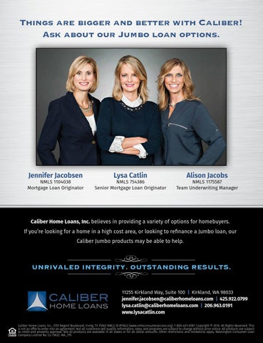 UNRIVALED INTEGRITY. OUTSTANDING RESULTS. 11255 Kirkland Way, Suite 100 | Kirkland, WA 98033 jennifer.jacobsen@caliberhomeloans.com | 425.922.0799 lysa.catlin@caliberhomeloans.com | 206.963.0191 www.lysacatlin.com Caliber Home Loans, Inc., 3701 Regent Boulevard, Irving, TX 75063 NMLS ID #15622 (www.nmlsconsumeraccess.org). 1-800-401-6587. Copyright Š 2016. All Rights Reserved. This is not an offer to enter into an agreement. Not all customers will qualify. Information, rates, and programs are subject to change without prior notice. All products bellevue club january 2015are|subject 7 to credit and property approval. Not all products are available in all states or for all dollar amounts. Other restrictions and limitations apply. Washington Consumer Loan Company License No. CL-15622. WA_779
