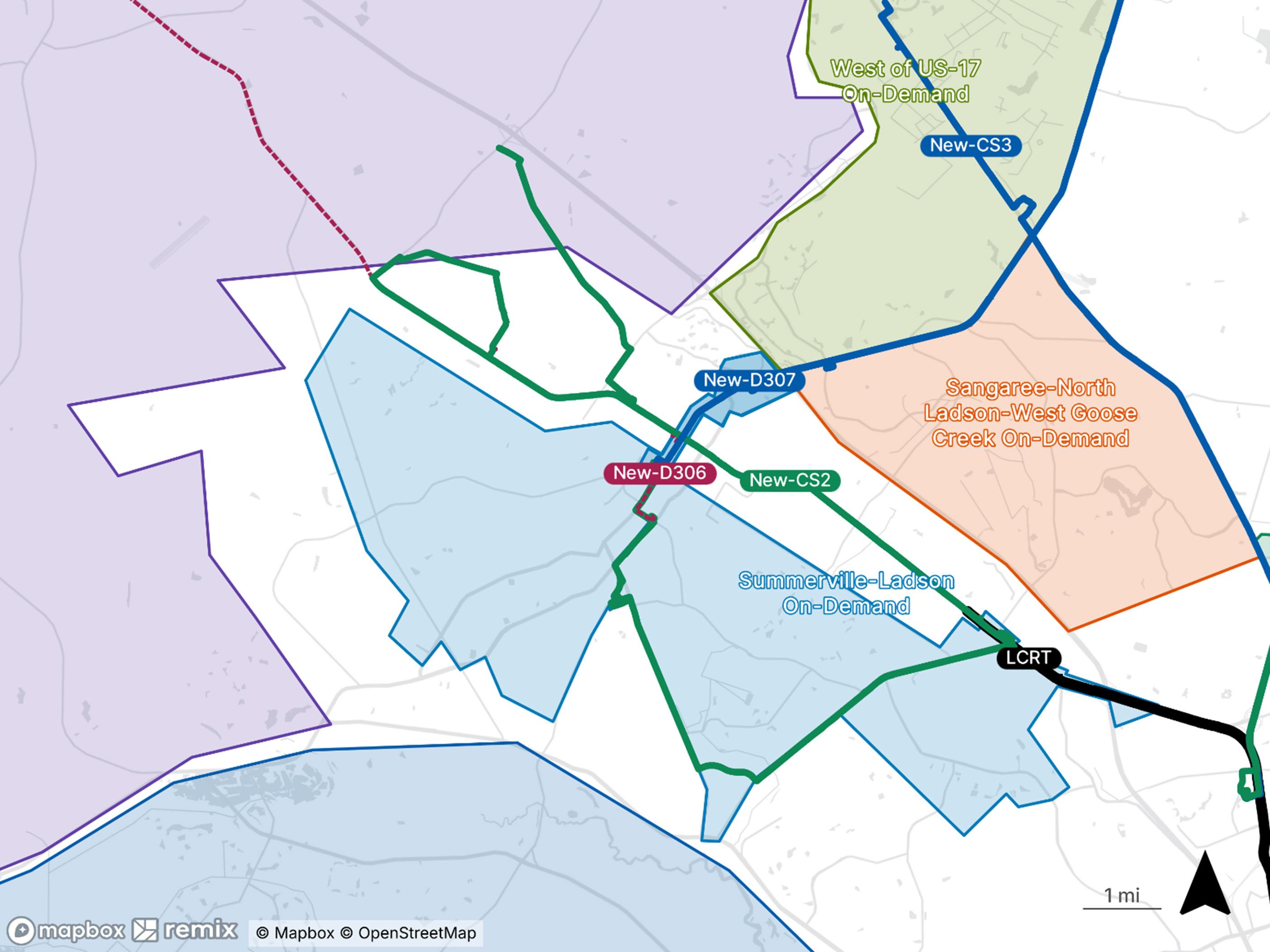 Two new on-demand zones would provide ondemand pick-up and drop-off service to anyone traveling within the zone. One zone is designed to expand access for people west of Downtown Summerville to Orangeburg Road. The other is designed to replace existing Route D305 service and expand access for people living south of Downtown Summerville to Ladson Road and Palmetto Commerce Parkway. Both zones connect to Walmart and other major retailers along US-17A.