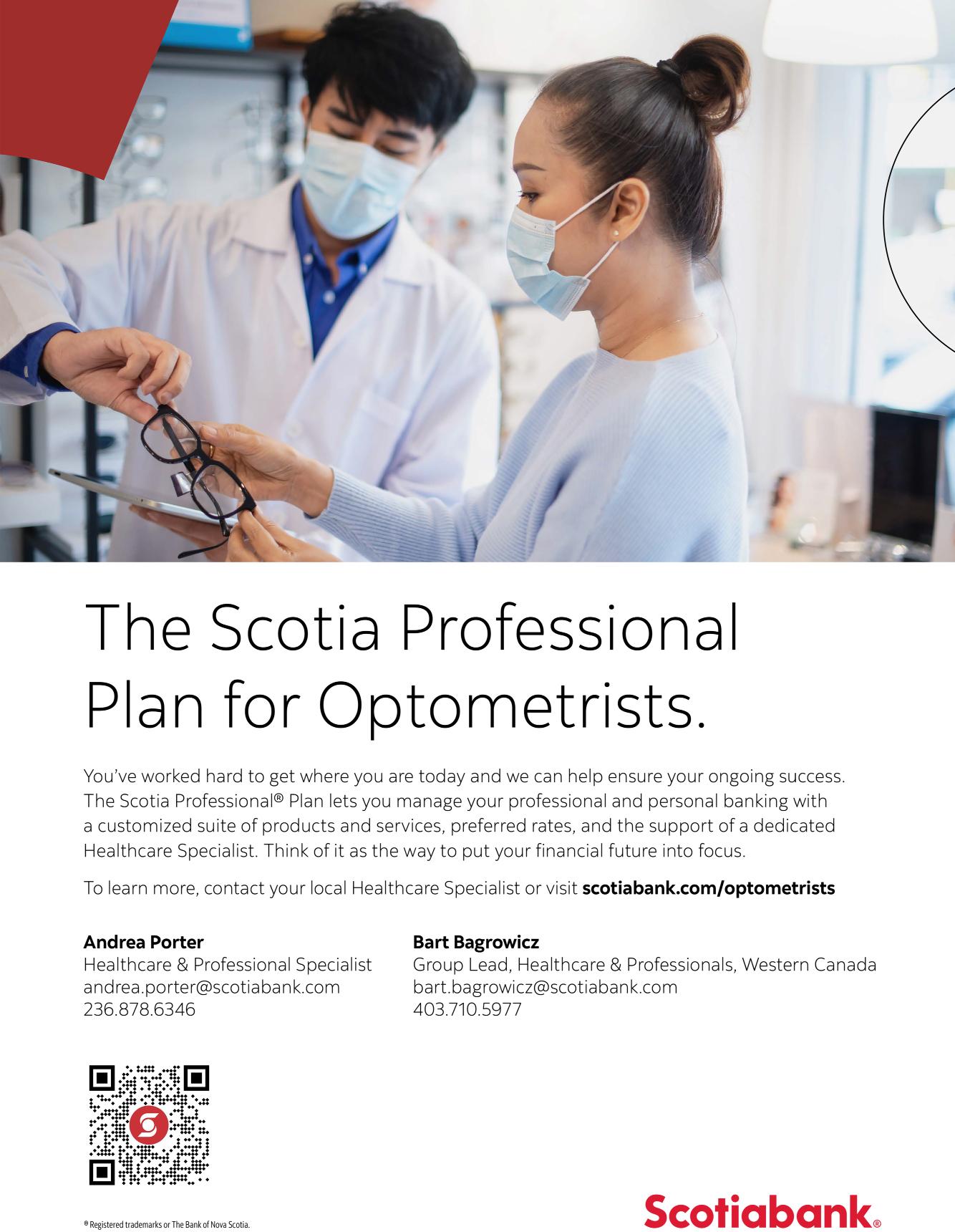 “One of the best strategies to help combat stress from managing multiple priorities is to surround yourself with the right people,” says Tom Apostolis, Regional Director, Healthcare & Professional Banking at Scotiabank. As a Director Apostolis leads a team of Healthcare Specialists that provides financial advice to many optometrists. He recommends finding an accountant that specializes in the profession who can help set you up with a sound business plan and structure for your prac-