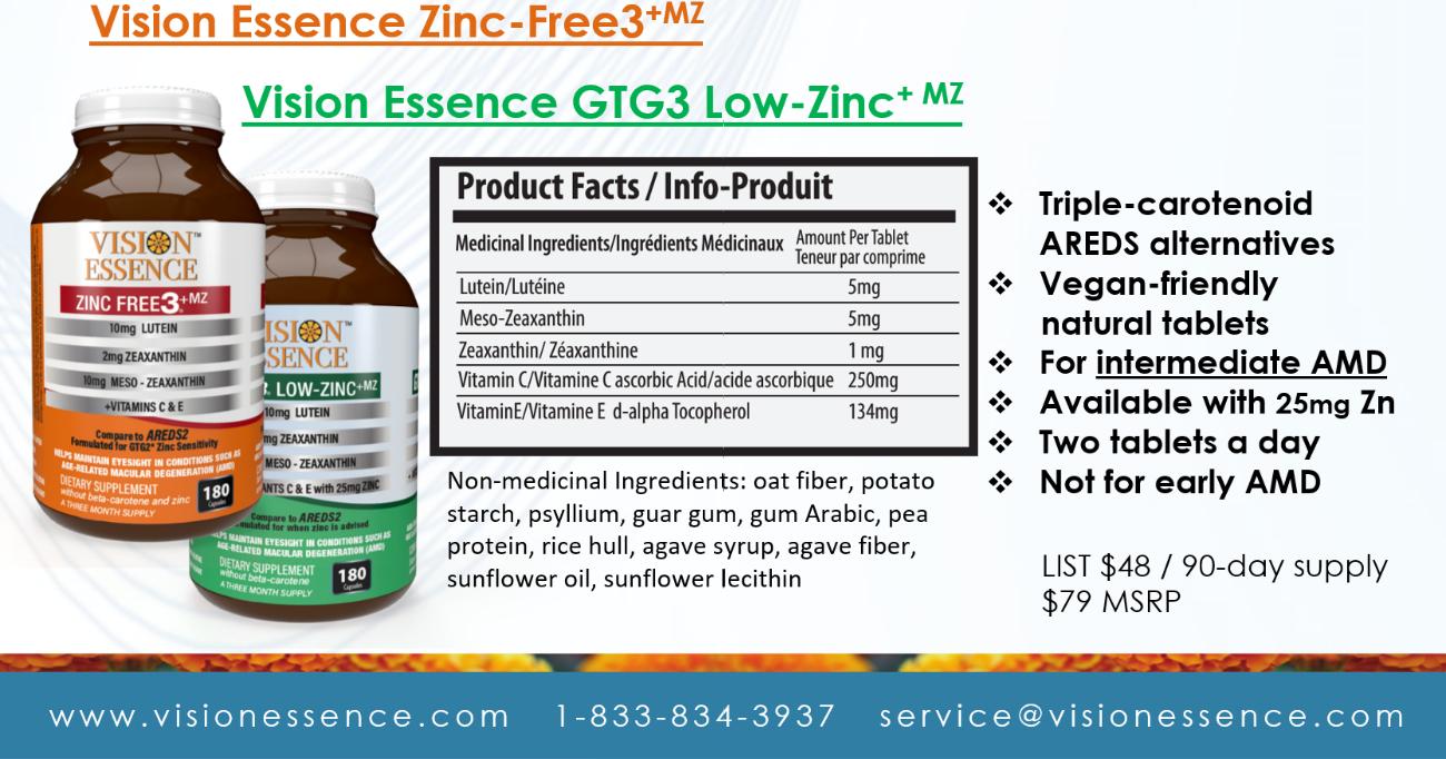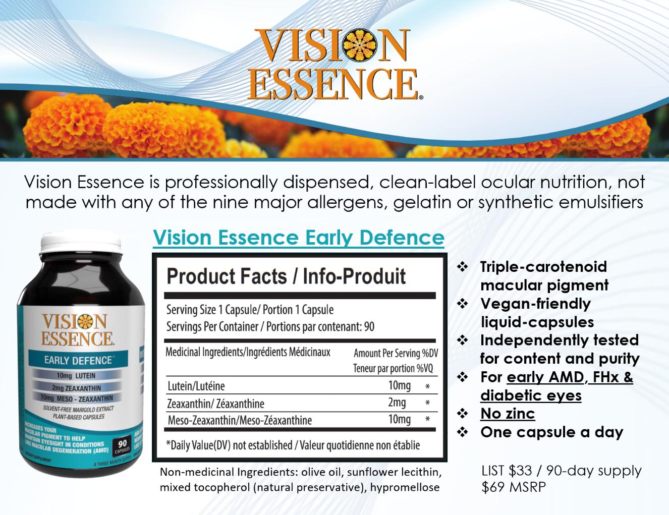 Contact Vision Essence to learn more about Early Defence liquid-filled hard capsules, a clean-label Natural Health Product containing all three macu-