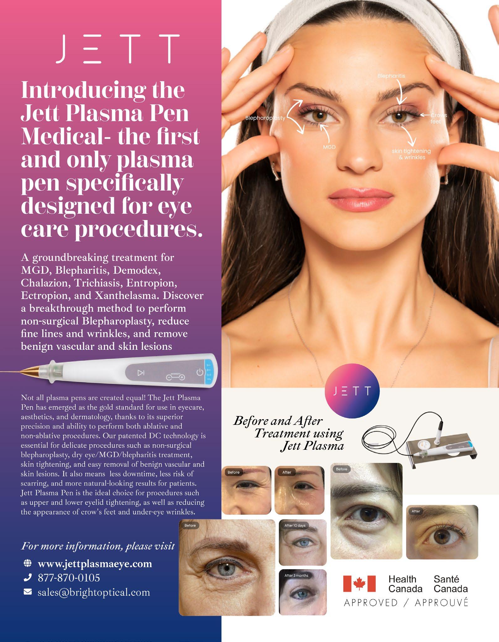 Now available in Canada, this groundbreaking device has revolutionized how eye care providers approach medical and cosmetic treatments for the delicate skin around the eyes. The Jett Plasma Pen’s precise application and minimal downtime make it a versatile, non-invasive solution for treating conditions including dry eye, MGD, blepharitis, chalazion, removal of benign vascular and skin lesions, eyelid tightening and non-surgical blepharoplasty.