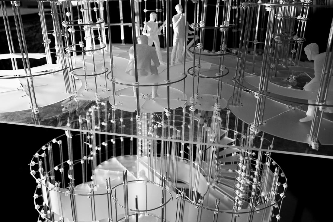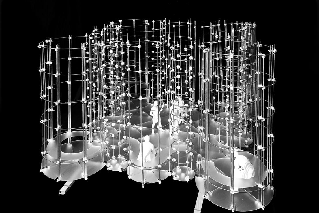 In the design, I "BUNDLED" cylinders (seatings, staircase, stage, ladder, planters) into a tower, much alike the way my joint is "BUNDLING" tubing of different diameter into a stronger and more meaningful verticle compound. These cylinders with various "heights" (Headroom), crossing multiple levels (staircases, ladders), join together at their perpendicular tangents and surround a stage area at the center naturally.