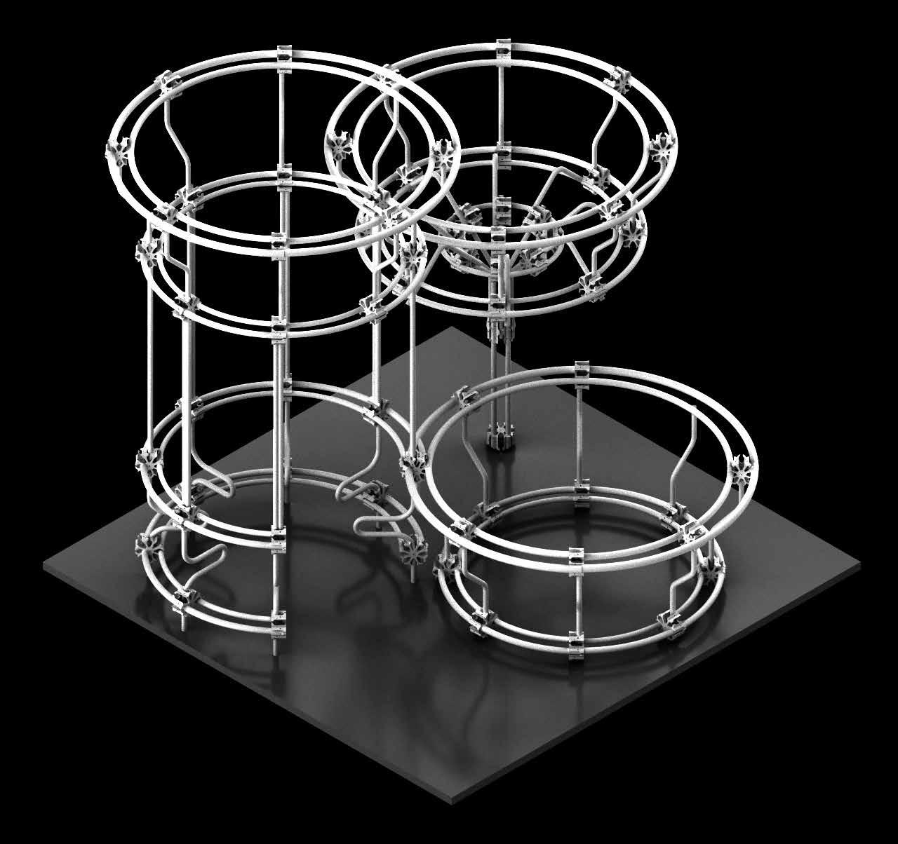 The studio is concerned with QUICK AND EASY ASSEMBLY, and departs from an interest in exploring the potential of the tube and joint system with an interest in building quickly-assembled, dismountable, strong, light and reconfigurable event infrastructure.