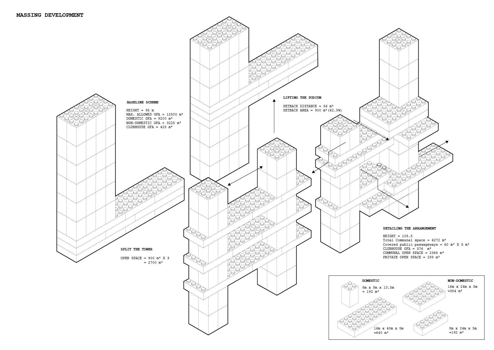 3. Rationalize step 2, calculate the volume of a baseline development scheme in the form of LEGO bricks, as the basic kit of parts for massing exercise.