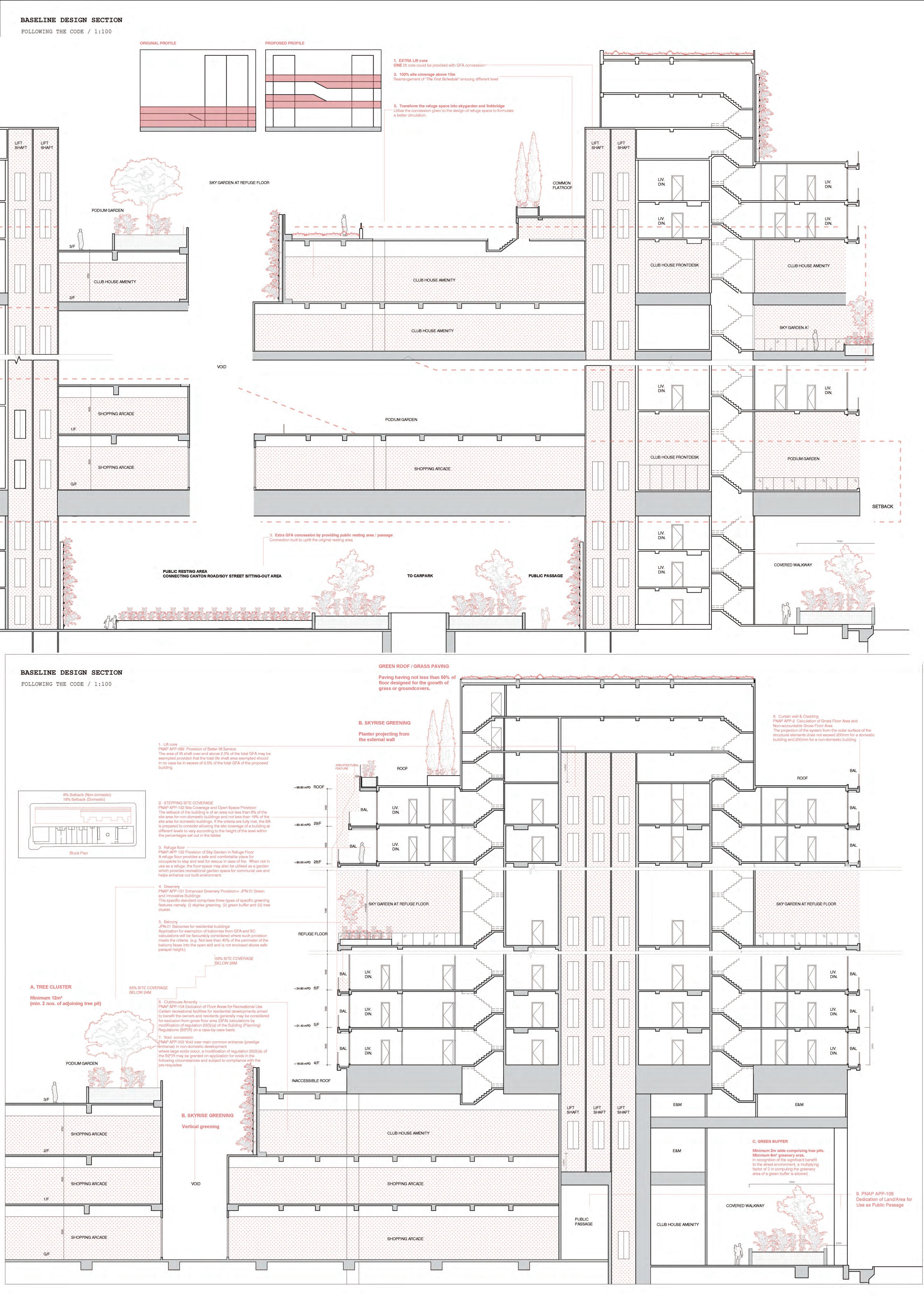 Under current building code, podiums with 100% site coverage is limited to be under 15m. As an efficient and profitable approach, planning would easily go as suggested to maximize the amount of saleable area of ground floor commercial plot. The First Schedule was set up to moderating development potential of site and prohibit over-dense proposal that hinder street ventilation and exposure. Yet, it also put forward a typology that slowly homogenise the urban environment of Hong Kong. Noted that the building department always value proposal that cater public interest, is it possible to obtain relaxation of building GFA and site coverage requirement via a strong dedication to the public open space provision?