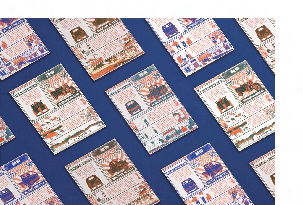 主形象以 " 發財車 (皮卡貨車) " 做為我們傳達的媒介,將貨車的概念與標準字聯結,粗細分明又帶點圓潤,而劃分 為四個階段的歷史,又將各個時期的特色產業與代表車款融入設計,試圖在輔助圖形裡加入各個時代的面貌,同時 配色採用台灣貨車最常見的色系,讓觀者能馬上產生共鳴且印象深刻。