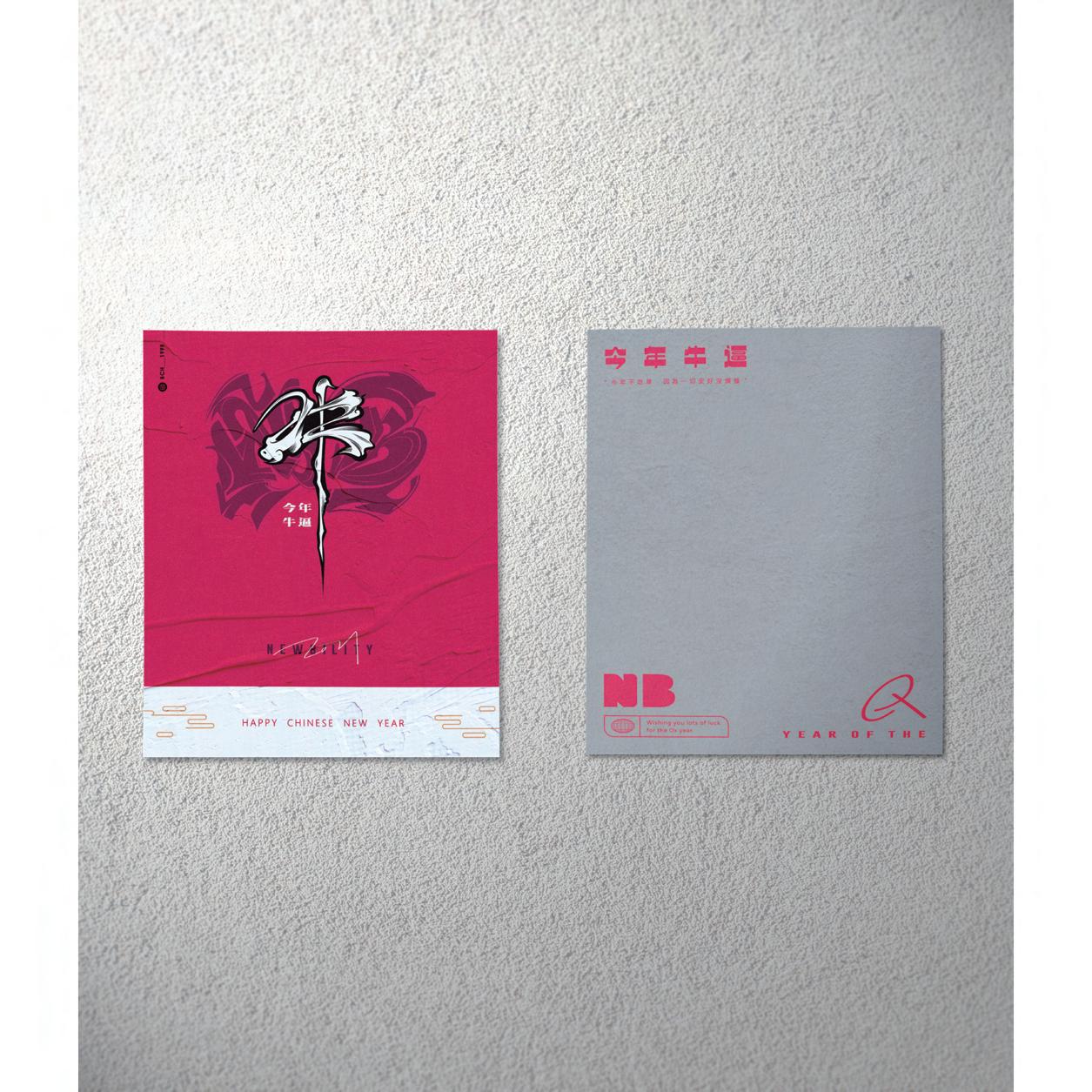以書法技法,在牛字的形上結合牛頭的印象,書法筆畫裡剛硬中帶有柔順的特色,混和美式插畫以塗鴉的風格,強化 牛字的衝擊力。整體形象除了牛年主字外,配合趣味標語以及圓潤化的 ”NB” 輔助圖形,色彩則採用了傳統色洋紅色 以及石灰作對比,在既有傳統中華文化的味道外,更顯潮流翻玩新型態,詮釋截然不同的新年形象。