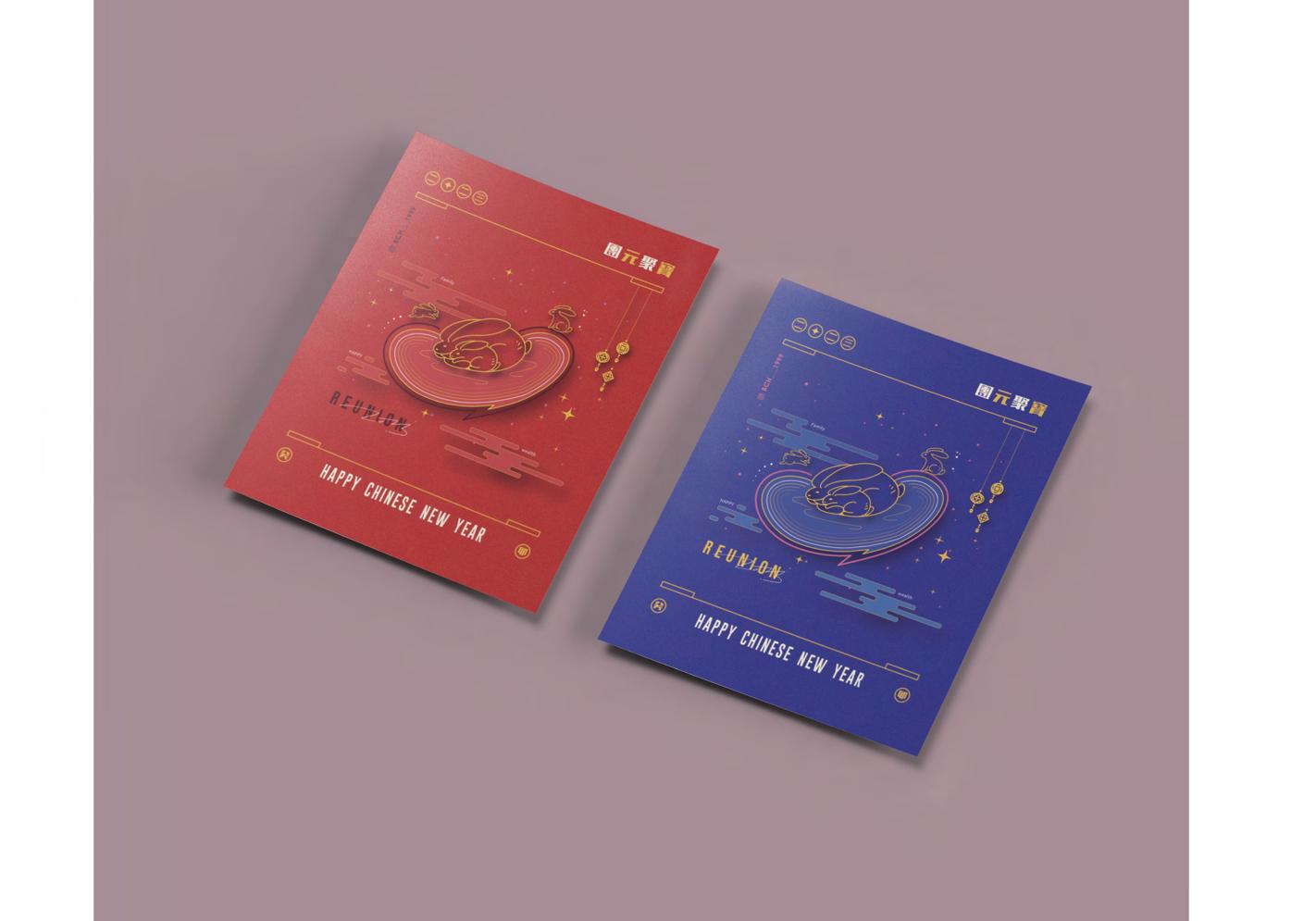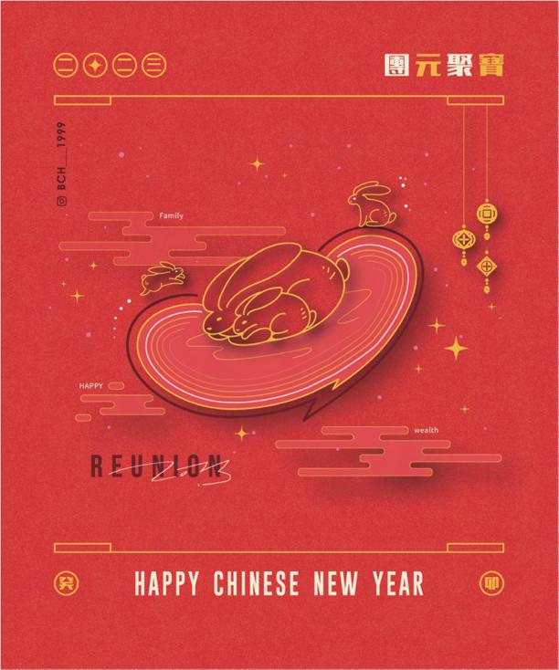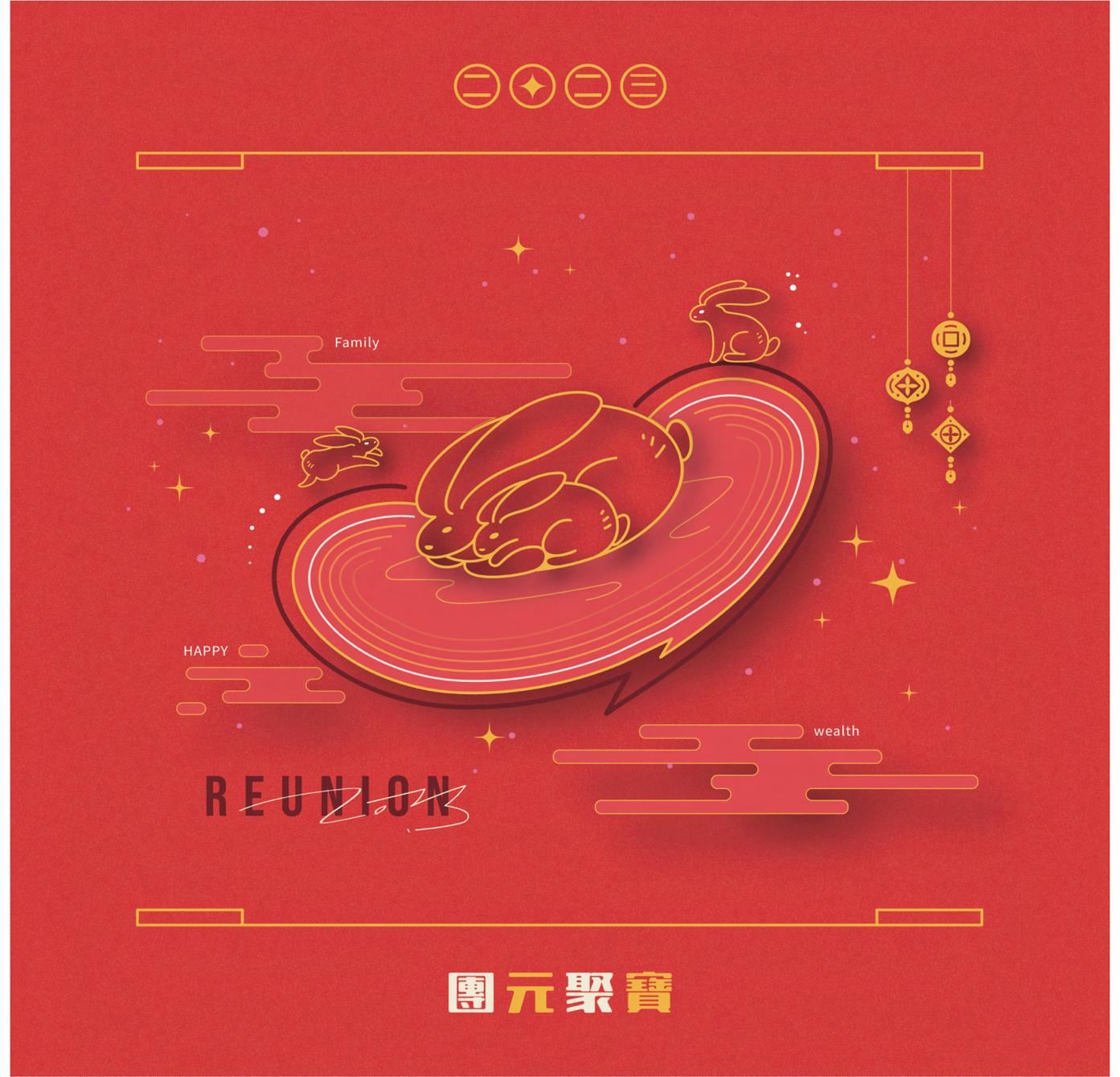 本次核心為 “ 團元聚寶 ” ,是 “ 元寶 ” 與 “ 團聚 ” 的諧音組合,代表著農曆新年的特色,小時候對於過年最有印象的 就是能收到許多紅包,而當長大了會發現,過年時和家人們的團聚時光,其實才是我們最大的收穫,甚至比 “ 財寶 ” 還來的重要許多,因此在視覺上以生肖兔子結合金元寶的形象作為出發點設計,色彩上分有兩版,一是新年主題色, 二則是以 “ 除夕夜 ” 為主題的夜晚配色版,元寶最外圍變成了粉色,猶如愛心般守護著兔子家的團圓。