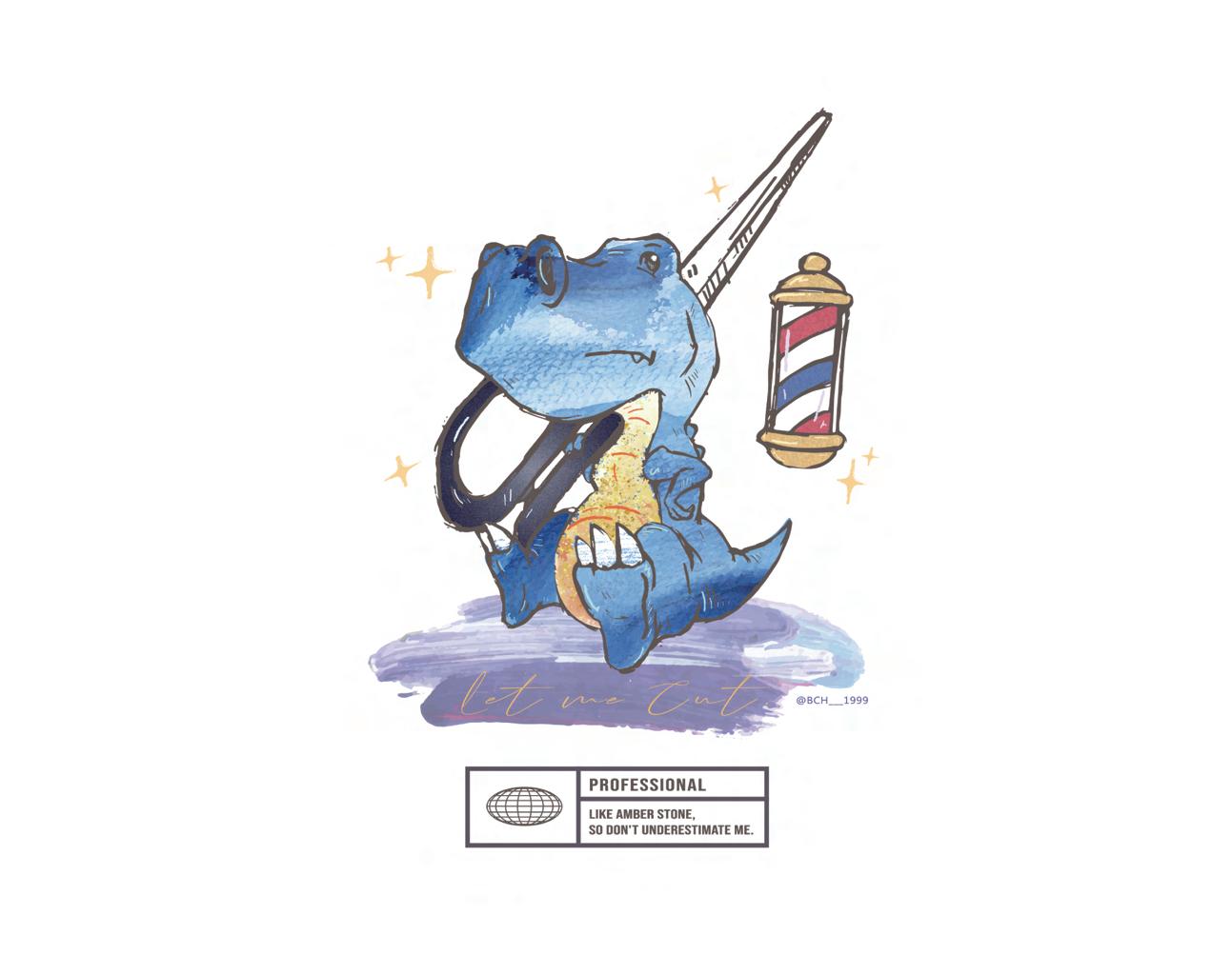 委託人是位美髮師,希望能有件獨一無二,主題是恐龍插畫的T-Shirt,同時要擁有美容美髮的元素。 插圖以Q版的暴龍做為主角,以剪刀與霓虹燈呈現出美髮特色,在材質搭配上以水彩和油膏做基底,搭配亮粉 的效果做出較童趣的感覺。