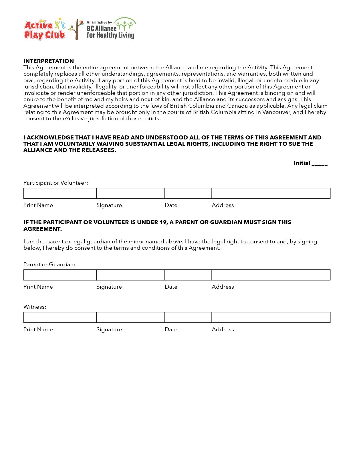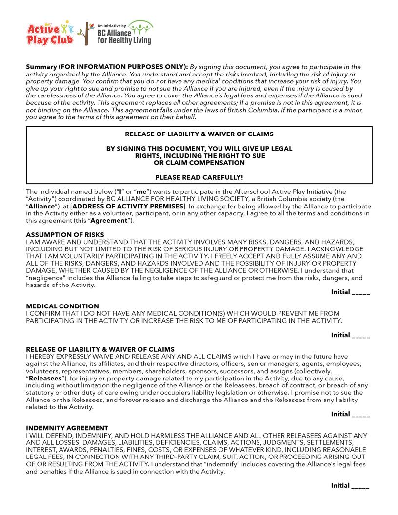 The individual named below (“ I ” or “me”) wants to participate in the Afterschool Active Play Initiative (the “Activity”) coordinated by BC ALLIANCE FOR HEALTHY LIVING SOCIETY, a British Columbia society (the “Alliance”), at [ADDRESS OF ACTIVITY PREMISES]. In exchange for being allowed by the Alliance to participate in the Activity either as a volunteer, participant, or in any other capacity, I agree to all the terms and conditions in this agreement (this “Agreement ”).
