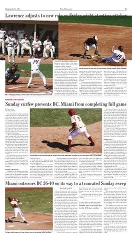 Asst. Sports Editor Just when Boston College was getting momentum back on its side against Miami in the second game of yesterday’s doubleheader, ACC rules shut down any hope of a complete comeback attempt. Down 7-3 going into the fifth inning, the Eagles started to get a rally going, cutting the lead to 7-6 before the inning ended. But since it was past 4:45 p.m. on a Sunday afternoon, ACC rules state that no inning can begin after that time, so the game was ruled over. The final result was a 7-6 Hurricanes win, through just five innings. “That was disappointing,” head coach Mike Gambino said of the curfew ending the game early. “Obviously we knew we were probably going to get, maybe a six-inning ballgame going in, so you kind of have that in your mind. They battled. It would have been nice to have one more inning.” The first pitch of the doubleheader came at 11:02 a.m., but the game lasted three hours and 45 minutes, delaying the start of game two until 3:16 p.m,. This forced the nightcap to last just one hour and 37 minutes. BC scored three runs in the bottom of the fifth before the rally and game came to an end on a Marc Perdios strikeout. “I thought the boys did a good job battling back and gave us a chance to win that ballgame at the end,” Gambino said. “It was unfortunate we ran into that time situation.” Pitching staff struggles Heading into the doubleheader, Gambino was planning on using Nate Bayuk to pitch the first six innings of the game before handing the ball over to the bullpen. The game plan didn’t pan out the way the