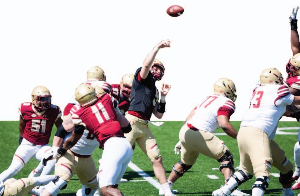 For the first time in nearly two years, fans sat in the stands of Alumni Stadium. Though it was minimal in size, the fan section—made up of Boston College football family members spread out across the bleachers on the field’s west side—was a welcome return for BC’s annual Jay McGillis Memorial Spring Game.