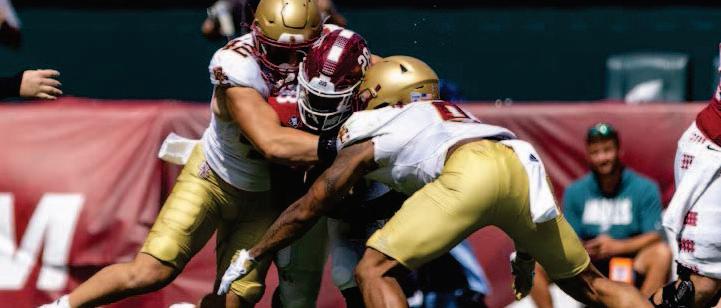 For the second game in a row, running the ball was the Eagles’ bread and butter. On 35 attempts, BC ran for 187 yards and three touchdowns. Running backs Garwo, Levy, Alec Sinkfield, and Xavier Coleman all had carries, Grosel ran for 45 yards, and wide receiver Zay Flowers caught a lateral pass that went for 47 yards down the left sideline.